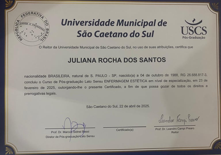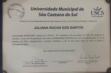 Sou Enfermeira Esteta, formada com graduação reconhecida pelo MEC, com pós-graduação em Estética Avançada e atuação regulamentada por leis e resoluções que asseguram a excelência do meu cuidado.